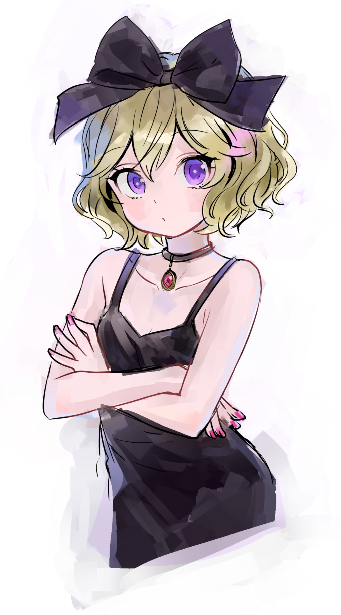10s 1girl ama-tou bare_arms bare_shoulders black_dress blonde_hair bow breasts cleavage collarbone crossed_arms dress elly_(tonari_no_kyuuketsuki-san) erie eyelashes female_focus hair_bow hair_ribbon highres jewelry looking_at_viewer nail_polish necklace purple_eyes ribbon sanpaku short_hair sleeveless small_breasts solo tonari_no_kyuuketsuki-san wavy_hair white_background