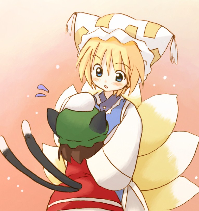 2girls :o animal_ears animal_hat bad_id bad_pixiv_id blonde_hair blue_eyes blush brown_hair cat_ears cat_tail chen collar comforting dress eijima_moko fox_tail frills hat head_on_chest headpat hug long_sleeves mob_cap multiple_girls multiple_tails open_mouth mob_cap short_hair sleeves_past_wrists tabard tail tareme teardrop touhou two_tails yakumo_ran