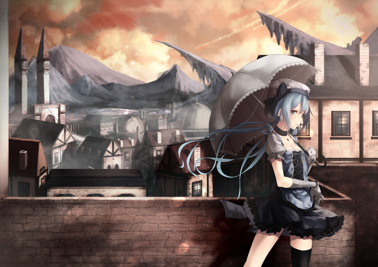 1girl asymmetrical_legwear bad_id bad_pixiv_id blue_eyes blue_hair blurry chimney choker city cliff depth_of_field dome elbow_gloves fantasy female_focus gloves hat hill house lee-chan_(saraki) lee_(saraki) lens_flare long_hair looking_at_viewer looking_to_the_side matching_hair/eyes original parasol profile saraki scenery skirt smile solo thighhighs tower umbrella uneven_legwear wind
