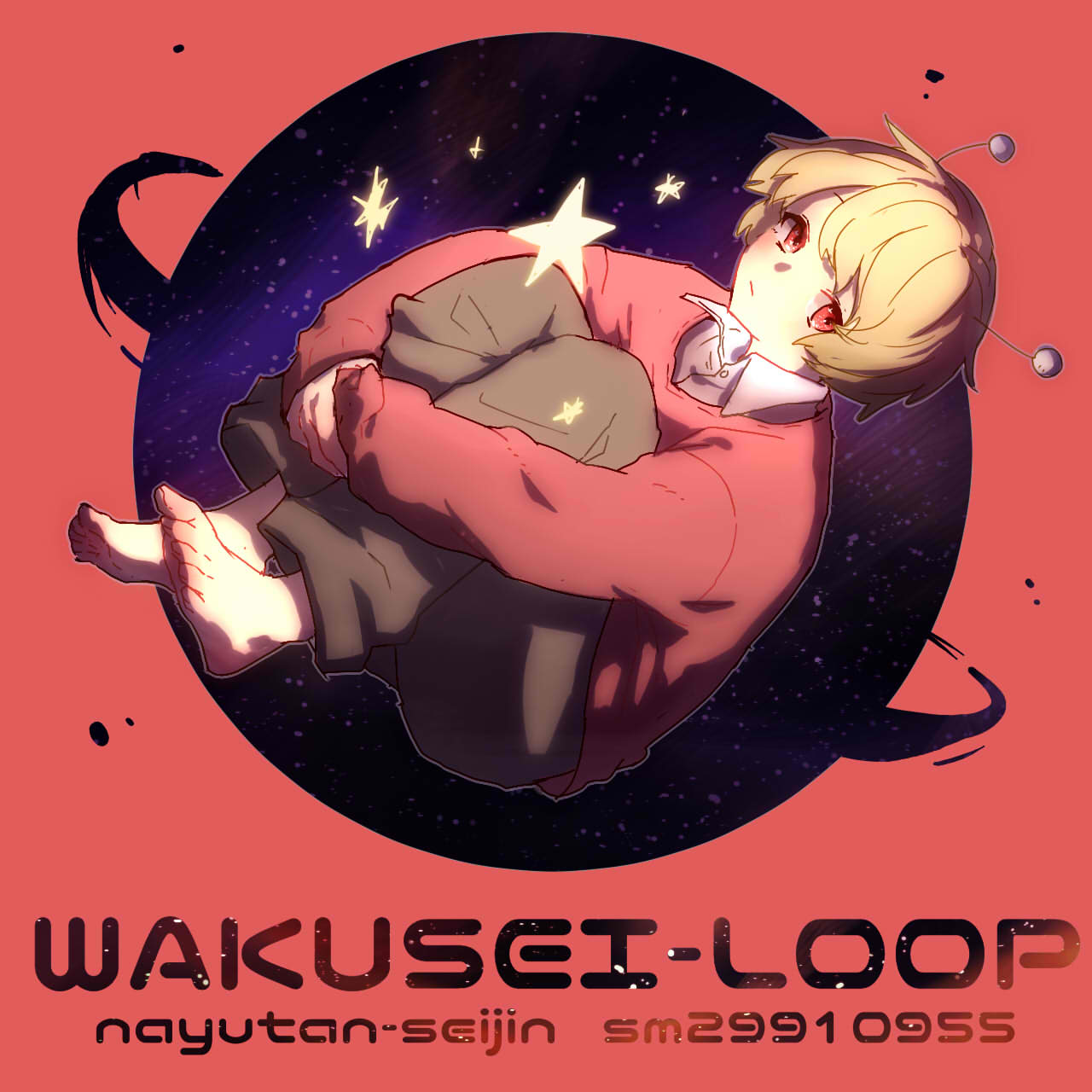 1boy andromedao andromedao_(cosplay) antennae barefoot blonde_hair cosplay fetal_position full_body highres indie_utaite koniro looking_at_viewer male_focus nayutan_sei_kara_no_butai nayutan_sei_kara_no_buttai niconico planet red_background red_eyes red_sweater school_uniform short_hair simple_background solo song_name sou_(utaite) star_(symbol) sweater utaite vocaloid wakusei_loop_(vocaloid)