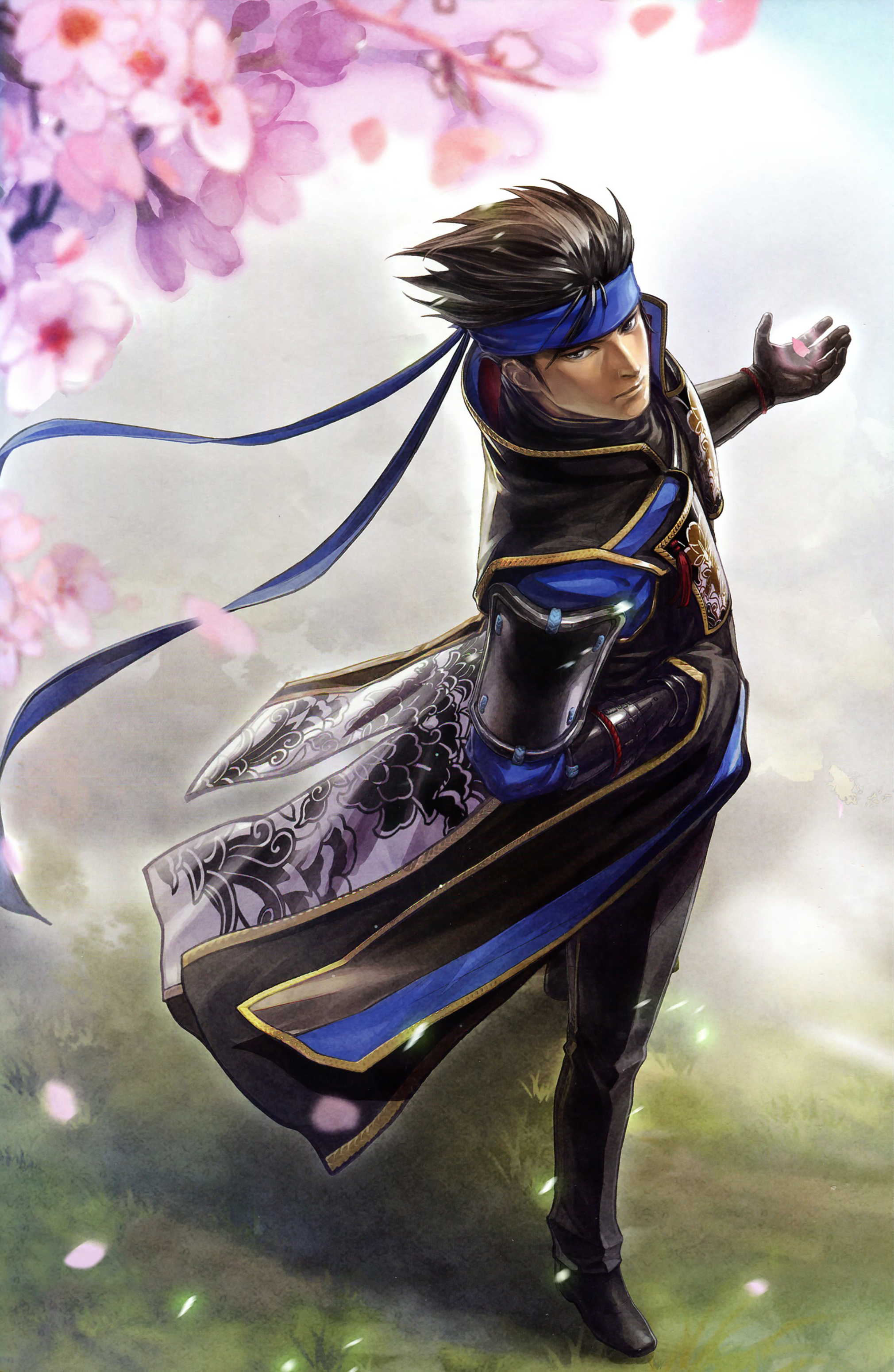 1boy absurdres brown_eyes brown_hair cherry_blossoms full_body gloves grass headband hidari_(left_side) highres male_focus matching_hair/eyes official_art petals solo toukiden_2 touya_(toukiden)