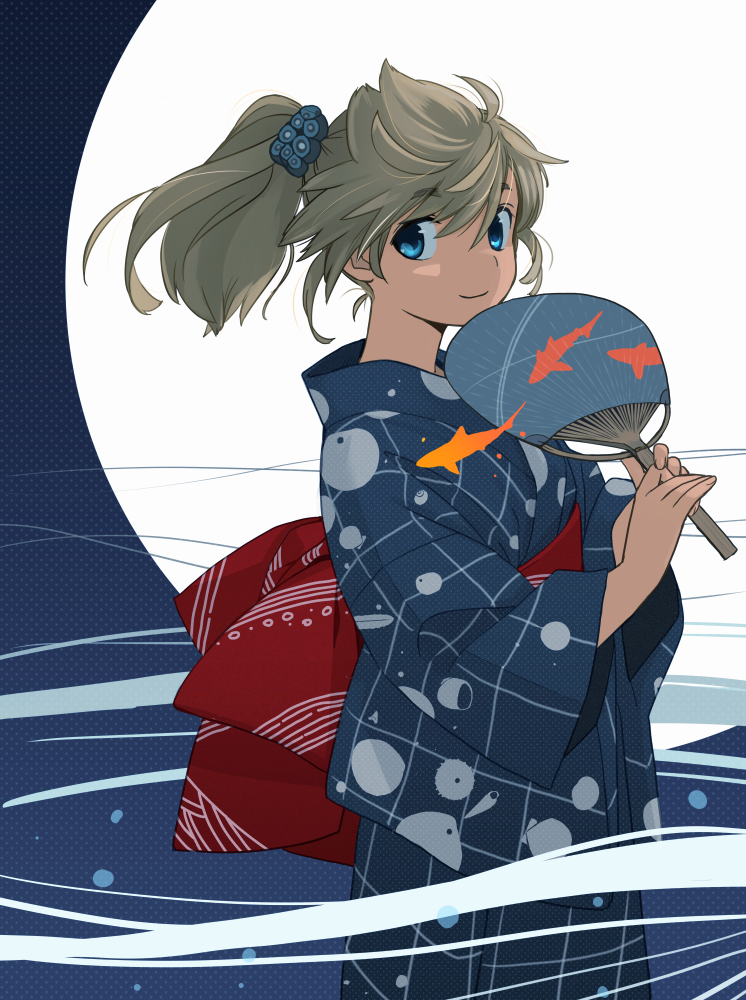 1girl akai_sashimi blonde_hair blue_eyes female_focus hand_fan japanese_clothes kimono looking_at_viewer mizunami_fossil_museum mizunami_mio paper_fan ponytail smile solo uchiwa yukata