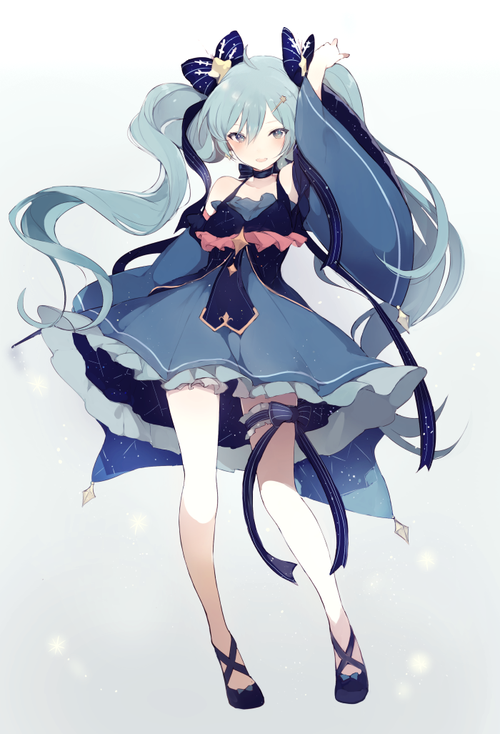 1girl aqua_hair arm_up blue_dress blue_eyes blue_ribbon dress female_focus floating_hair frilled_dress frilled_ribbon frills full_body hair_between_eyes hair_ornament hair_ribbon hairclip hatsune_miku leg_ribbon long_hair looking_at_viewer lpip open_mouth pantyhose ribbon smile solo standing star_(symbol) star_hair_ornament starry_sky_print striped_ribbon thigh_ribbon vocaloid wide_sleeves yuki_miku