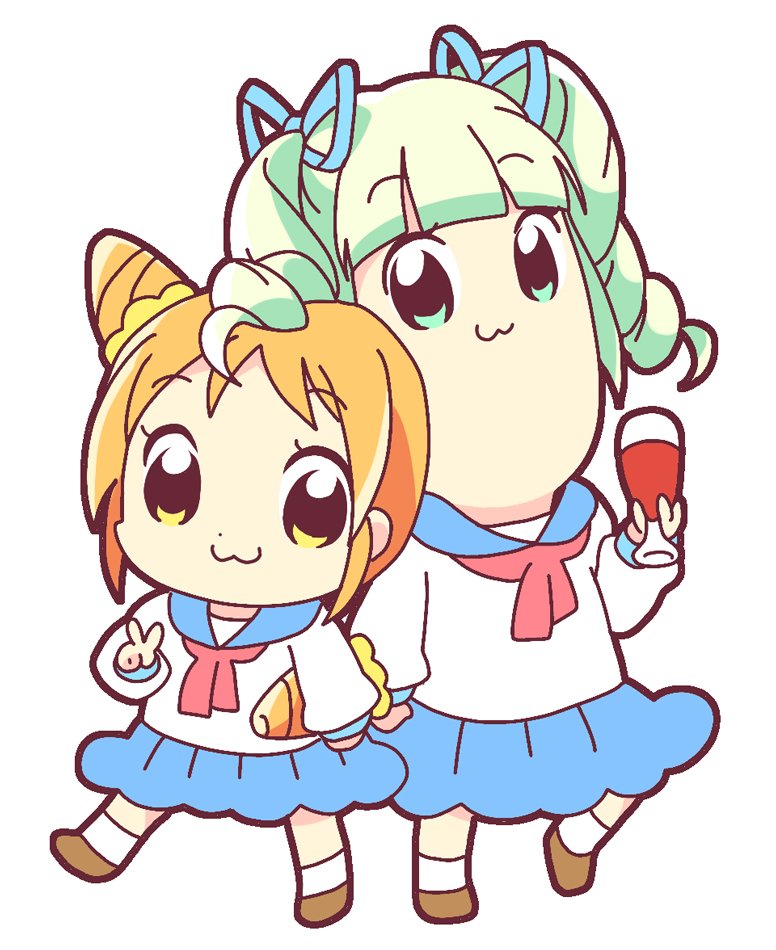 10s 2girls :3 aikatsu! aikatsu!_(series) arisugawa_otome arisugawa_otome_(cosplay) bkub_(style) blue_ribbon blue_skirt blunt_bangs brown_footwear closed_mouth cone_hair_bun cosplay cup drill_hair drink drinking_glass food full_body glass hair_bun hair_ornament hair_ribbon hair_scrunchie hand_up holding holding_cup holding_drinking_glass long_hair long_sleeves looking_at_viewer mirai_(sugar) multiple_girls neckerchief pipimi pleated_skirt poptepipic popuko red_neckerchief ribbon school_uniform scrunchie serafuku shoes short_hair single_hair_bun skirt smile socks standing standing_on_one_leg todo_yurika_(cosplay) todo_yurika twin_drills twintails v white_legwear