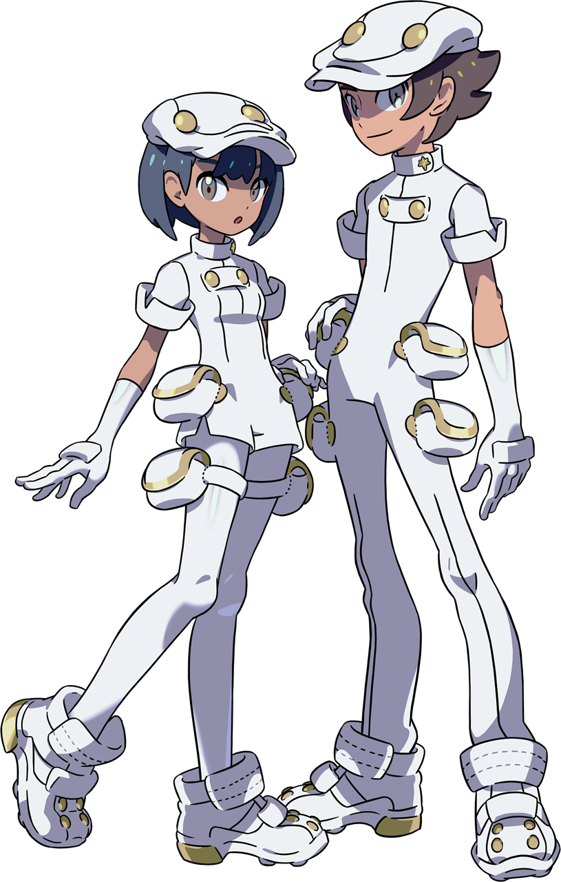 1boy 1girl :o aether_foundation_employee aether_foundation_employee_(female) aether_foundation_employee_(male) black_hair breasts brown_eyes brown_hair buttons closed_mouth dark-skinned_male dark_skin elbow_gloves full_body gloves hair_between_eyes hat highres jumpsuit nintendo npc_trainer official_art open_mouth pantyhose pokemon pokemon_sun_and_moon pouch shoes short_hair short_jumpsuit short_sleeves small_breasts smile standing standing_on_one_leg take_(takegarou) thigh_strap transparent_background turtleneck unitard white_gloves white_hat white_jumpsuit white_pantyhose white_shoes