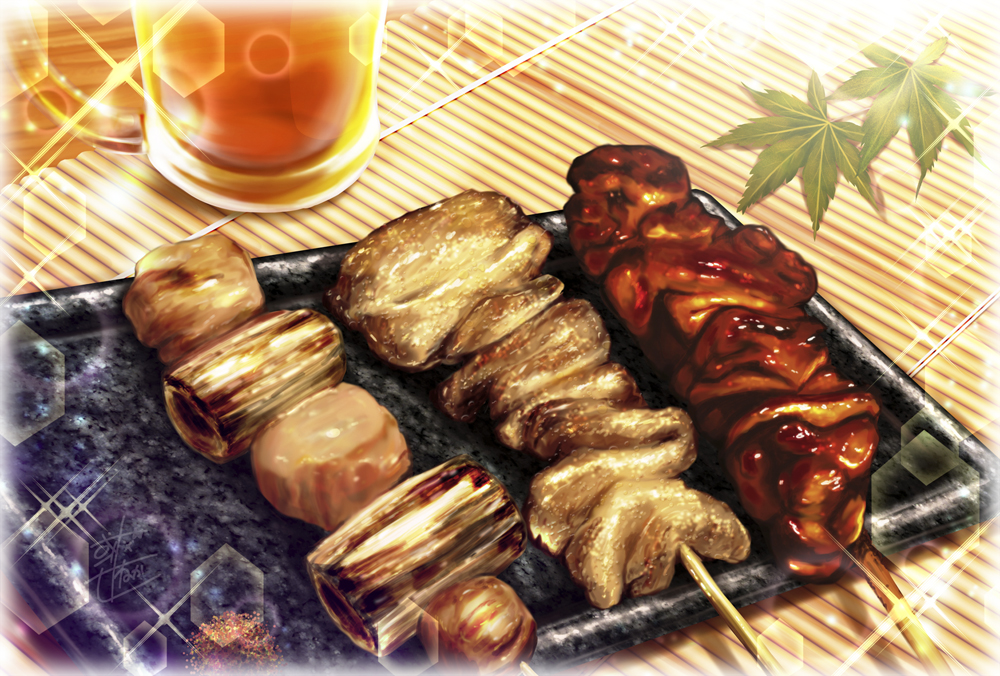 alto_seneka chinese_zodiac food food_focus leaf lens_flare no_humans original shish_kebab signature year_of_the_rooster