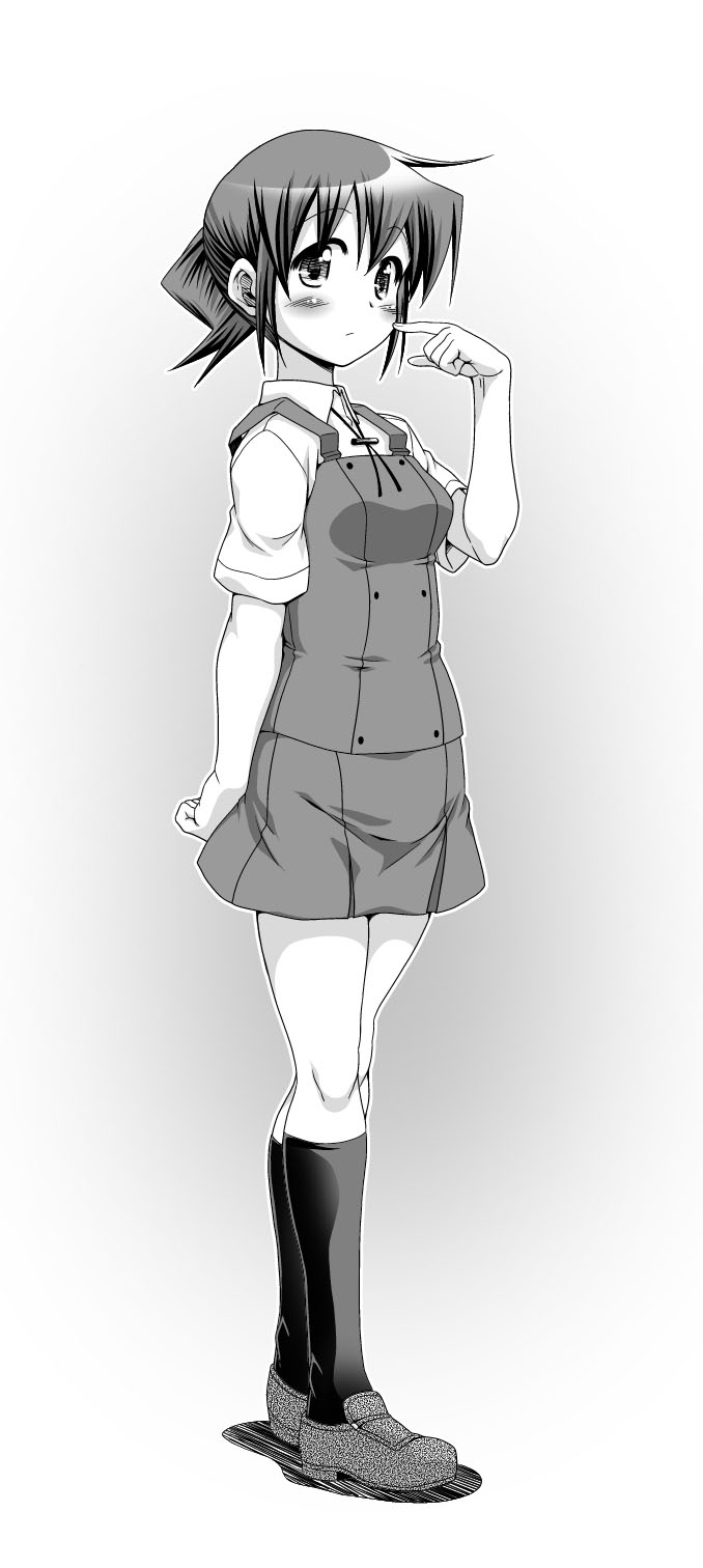 1girl bad_id bad_pixiv_id blush female_focus full_body greyscale hidamari_sketch highres legs monochrome nori_(hidamari_sketch) school_uniform short_hair socks solo yamabuki_high_school_uniform yoshitani_motoka