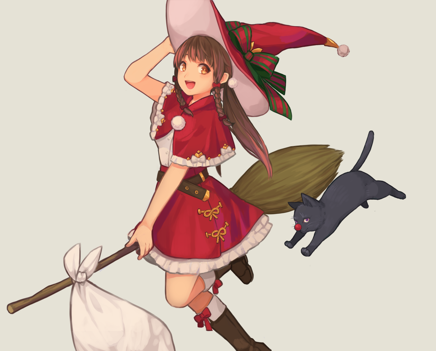 1girl :d animal arm_up belt black_cat boots bow braid broom broom_riding brown_eyes brown_footwear brown_hair capelet cat christmas clown_nose from_side grey_background hair_ribbon hand_on_headwear hat knee_boots leg_up long_hair looking_at_viewer open_mouth original outstretched_arm purple_eyes red_bow red_ribbon red_skirt ribbon sack saino_(sainoomisaki) shirt simple_background skirt smile striped_bow striped_ribbon twin_braids twintails white_shirt witch witch_hat