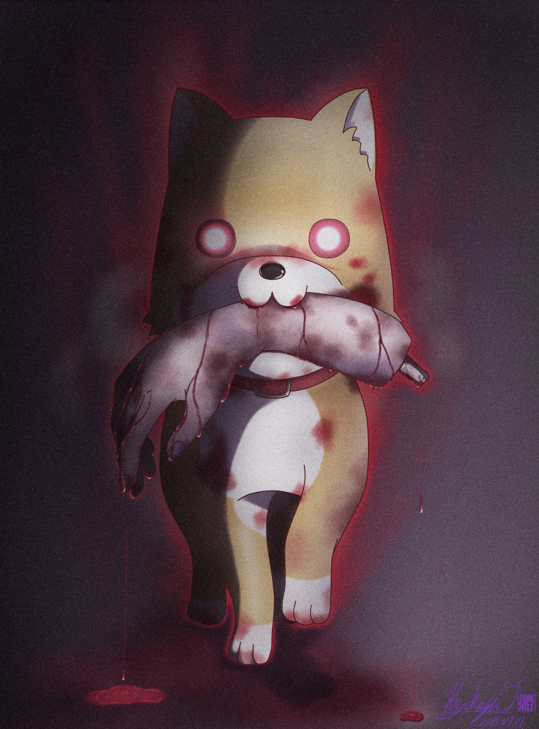 10s 2015 animal_focus artist_name aura blood creepy dark_aura dated dog dripping full_body gakkou_gurashi! glowing glowing_eyes horror_(theme) kiyokazu looking_at_viewer mouth_hold o_o pool_of_blood red_eyes severed_arm severed_limb signature spoilers taroumaru_(gakkou_gurashi)
