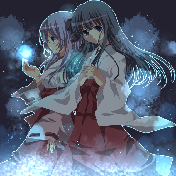 00s 2girls bad_id bad_pixiv_id blue_eyes blue_hair detached_sleeves furude_rika hakama hakama_skirt hanyuu higurashi_no_naku_koro_ni horns japanese_clothes miko multiple_girls purple_hair red_hakama skirt tsukioka_tsukiho