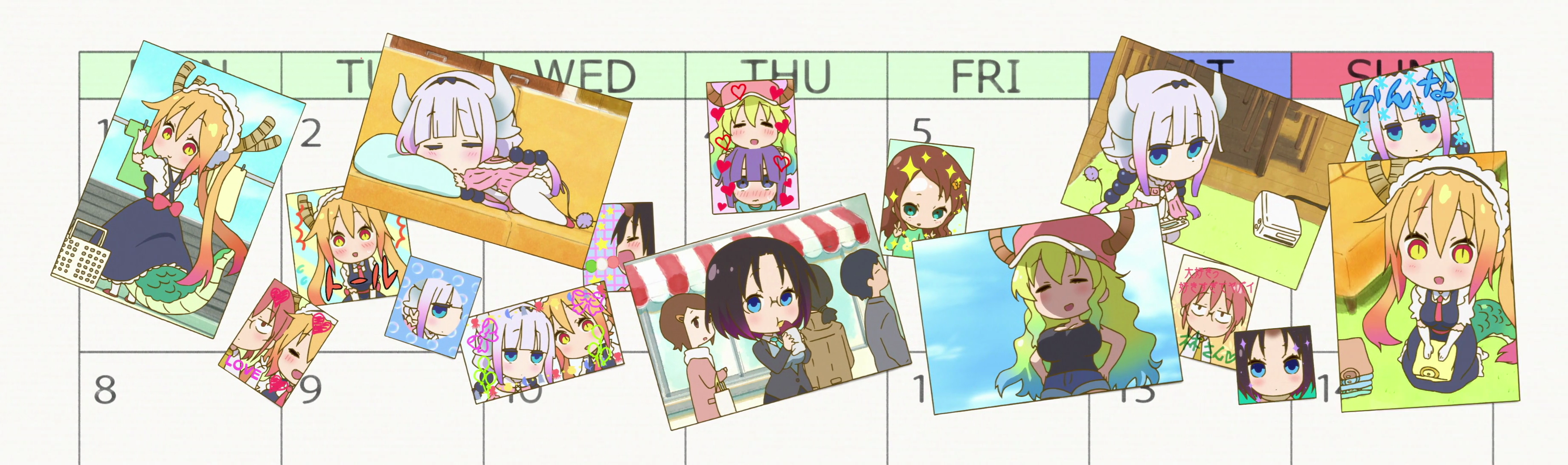 10s :d ^^^ absurdres anime_screenshot calendar child closed_eyes dragon_girl dragon_horns dragon_tail elma_(maidragon) english_text gradient_hair green_hair highres horns kanna_kamui kobayashi-san_chi_no_maidragon kobayashi_(maidragon) lucoa_(maidragon) magatsuchi_shouta multicolored_hair multiple_girls open_mouth photo_(object) saikawa_riko shiny_skin short_hair single_horn sleeping smile stitched tail third-party_edit tohru_(maidragon) twintails wavy_hair