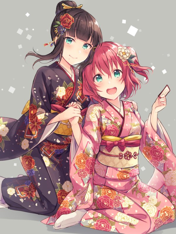 10s 2girls :d black_hair black_kimono blunt_bangs card floral_print flower green_eyes grey_background hair_bun hair_flower hair_ornament holding_hands japanese_clothes kimono kurosawa_dia kurosawa_ruby looking_at_viewer love_live! love_live!_school_idol_festival love_live!_sunshine!! mole mole_under_mouth multiple_girls no_shoes obi one_side_up open_mouth pink_kimono red_hair sakou_mochi sash short_hair siblings side_ponytail single_hair_bun sisters sitting smile tabi wariza