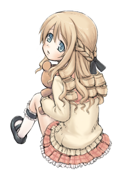 00s 1girl back black_bow blonde_hair blue_eyes bow braid byakudan_kagome cardigan chaudlapin curly_hair female_focus from_behind full_body hair_bow half_updo holding holding_stuffed_toy kneehighs long_hair long_sleeves looking_at_viewer looking_back mary_janes oshibaru parted_lips pink_skirt plaid_clothes plaid_skirt pleated_skirt school_uniform serafuku shirt shoes simple_background sitting skirt socks solo strawberry_panic! stuffed_animal stuffed_toy teddy_bear white_background white_socks yellow_shirt