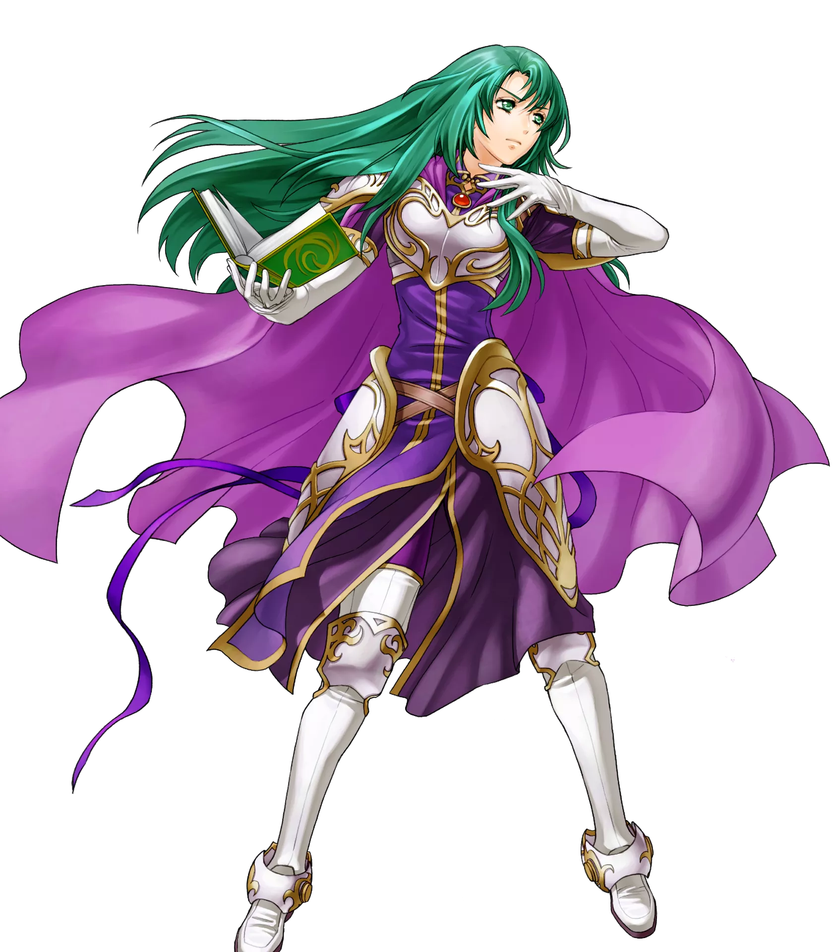 1girl armor book boots breastplate cape cecilia_(fire_emblem) female_focus fire_emblem fire_emblem:_the_binding_blade fire_emblem_heroes full_body gloves green_eyes green_hair highres kita_senri long_hair nintendo official_art solo transparent_background white_armor