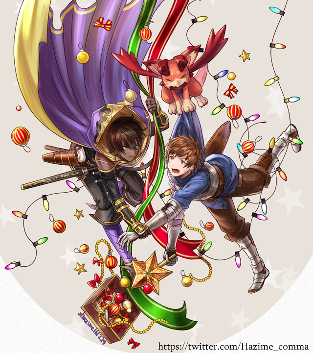 >_< 10s 2boys armor armored_boots bad_id bad_pixiv_id boots christmas_lights christmas_ornaments cloak closed_eyes dark-skinned_male dark_skin dragon fighter_(granblue_fantasy) gran_(granblue_fantasy) granblue_fantasy hajime_(gitoriokawaii) hood hooded_cloak hoodie jamil_(granblue_fantasy) male_focus multiple_boys pulling scar sheath sheathed sweatdrop very_dark_skin vyrn_(granblue_fantasy)