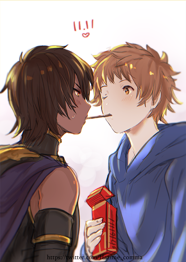 10s 2boys bad_id bad_pixiv_id bare_shoulders black_hair blush box brown_eyes brown_hair cloak dark_skin dark-skinned_male dated fighter_(granblue_fantasy) food gran_(granblue_fantasy) granblue_fantasy hajime_(gitoriokawaii) hood jamil_(granblue_fantasy) male_focus multiple_boys one_eye_closed pocky pocky_day pocky_kiss red_eyes shared_food short_hair sweatdrop twitter_username upper_body very_dark_skin watermark yaoi