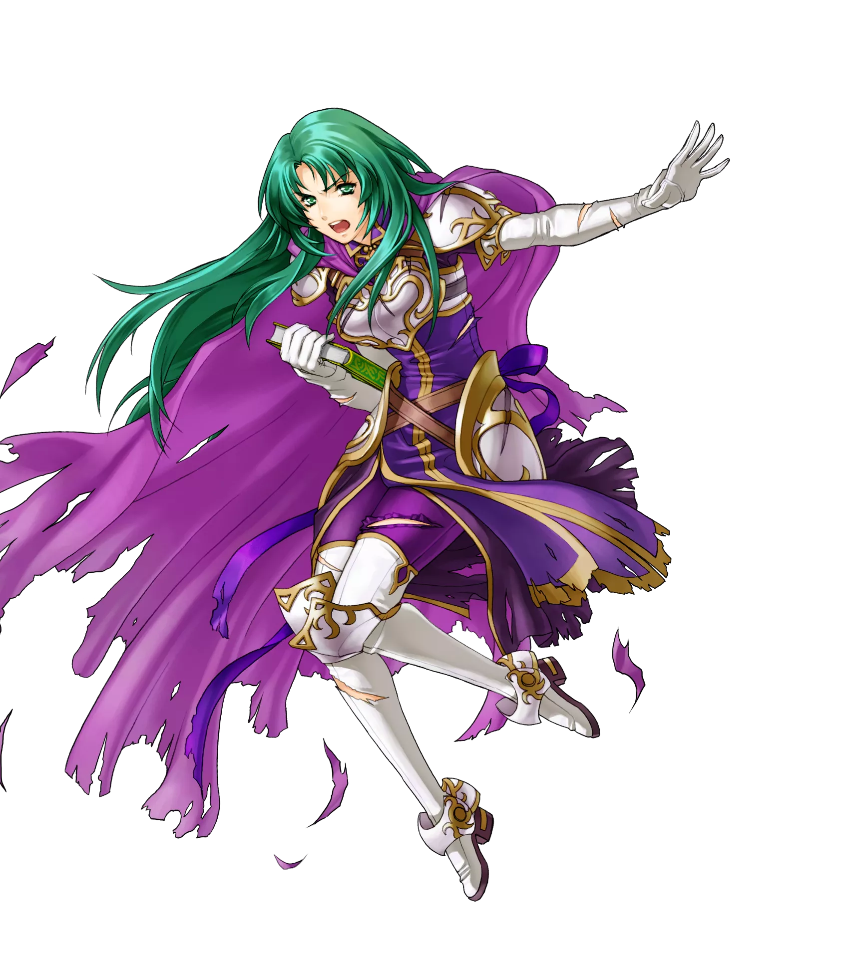 1girl armor book boots breastplate cape cecilia_(fire_emblem) female_focus fire_emblem fire_emblem:_the_binding_blade fire_emblem_heroes full_body gloves green_eyes green_hair highres injury kita_senri long_hair nintendo official_art open_mouth ryona solo teeth torn_clothes transparent_background white_armor