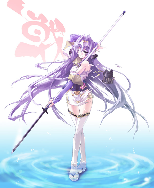 1girl armor crossed_legs elbow_gloves female_focus full_body gloves naginata one_eye_closed polearm purple_hair rance_(series) ripples sakura_nitouhei sandals sengoku_rance senhime solo spear standing thighhighs tiara tokugawa_sen torn_clothes wading water watson_cross weapon white_thighhighs zouri