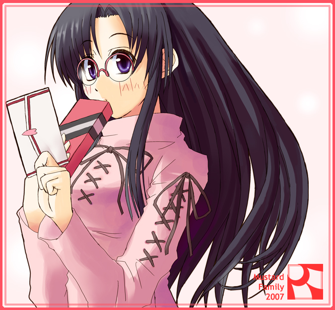 1girl black_hair blush embarrassed female_focus gift glasses holding holding_gift letter long_hair love_letter minazuki_jiyun original purple_eyes solo sweater turtleneck valentine