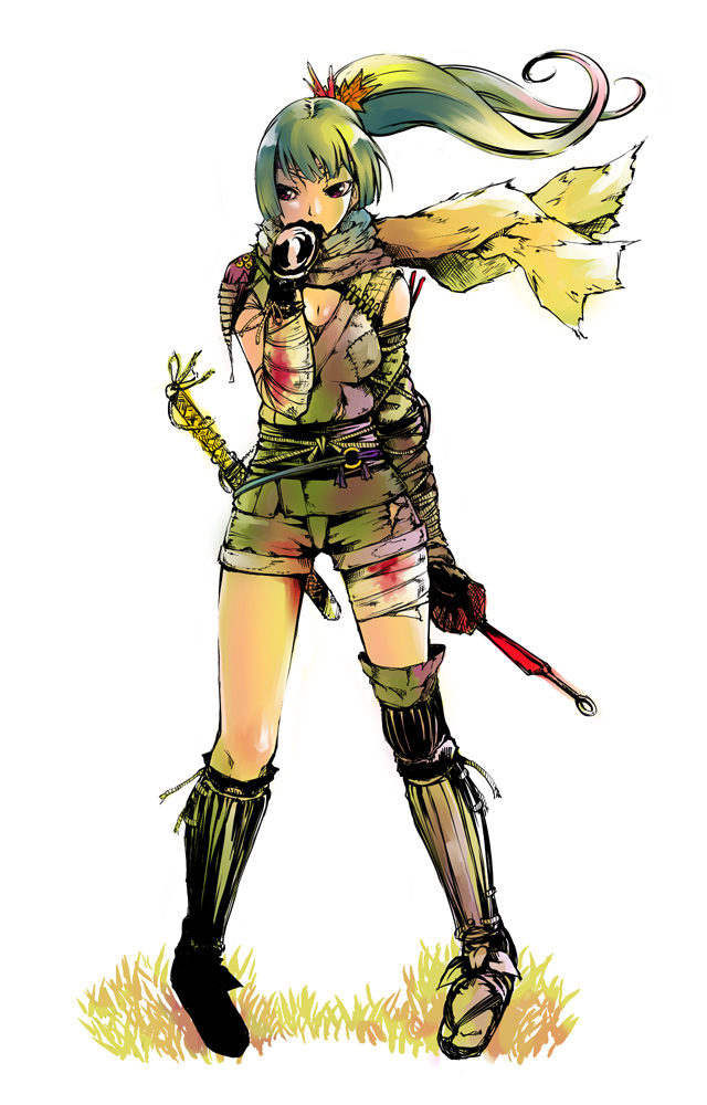1girl asymmetrical_clothes bandages blood female_focus gloves grass green_hair kunai long_hair maybe ninja original ponytail red_eyes scabbard scarf sheath simple_background solo sword thighhighs torn_clothes weapon