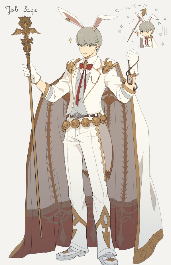 1boy bad_id bad_twitter_id cape cosplay formal_clothes full_body grey_eyes grey_hair looking_at_viewer male_focus manaka_(gunjooou) narukami_yu persona persona_4 sage_(granblue_fantasy) short_hair smile suit