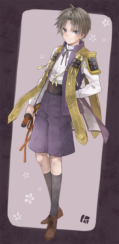 10s 1boy aged_down armor bad_id bad_pixiv_id black_socks brown_hair child heshikiri_hasebe japanese_armor k-mame kneehighs male_focus purple_eyes shorts shoulder_armor smile socks sode touken_ranbu