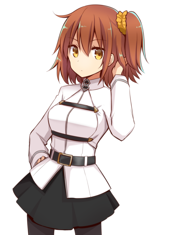 1girl cowboy_shot fate/grand_order fate_(series) female_focus fujimaru_ritsuka_(female) hair_between_eyes hair_ornament hair_scrunchie hand_in_own_hair hand_on_own_hip orange_hair pantyhose quro_(black_river) scrunchie short_hair side_ponytail simple_background solo white_background yellow_eyes
