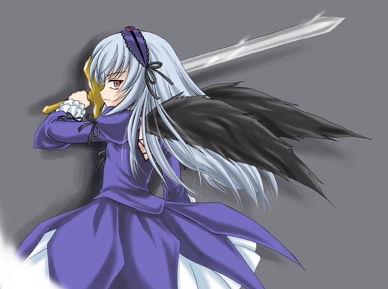 00s 1girl black_wings bow cowboy_shot dress female_focus frilled_sleeves frills grey_background grey_hair hairband headband juliet_sleeves lolita_hairband long_hair long_sleeves puffy_long_sleeves puffy_sleeves purple_dress ribbon rozen_maiden simple_background solo standing suigintou sword unsheathed wan'yan_aguda weapon wings