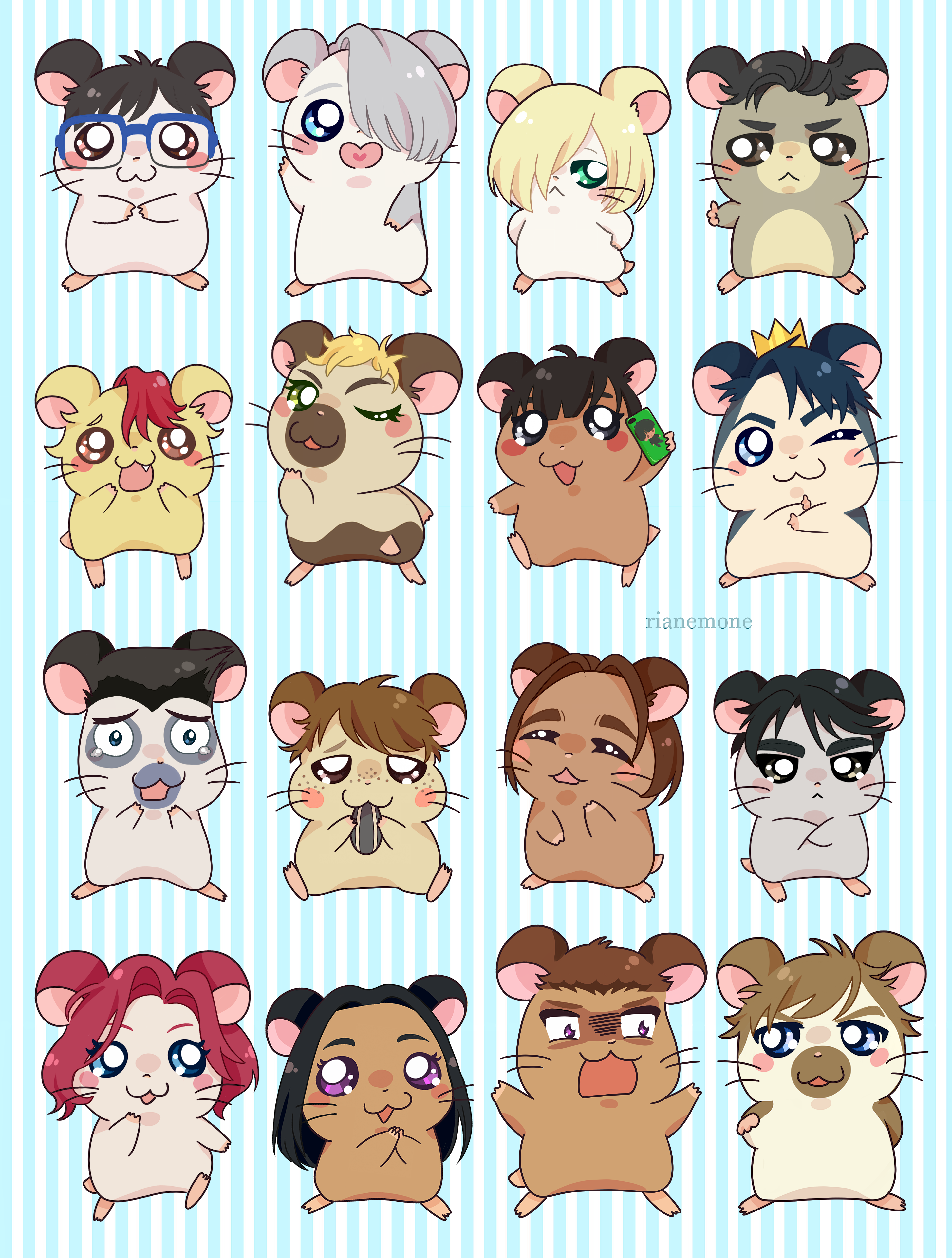 10s :< :3 ;3 absurdres animalization artist_name black_hair blonde_hair blue-framed_eyewear blue_eyes blush_stickers brown_eyes brown_hair cellphone christophe_giacometti crown eating emil_nekola closed_eyes georgi_popovich glasses green_eyes grey_eyes hair_over_one_eye hamster hamtaro_(series) heart heart_in_mouth highres jean-jacques_leroy ji_guang-hong katsuki_yuuri lee_seung-gil leo_de_la_iglesia michele_crispino mila_babicheva minami_kenjirou no_humans one_eye_closed open_mouth otabek_altin phichit_chulanont phone purple_eyes red_hair ri_(rianemone) sara_crispino seed silver_hair smartphone smile sunflower_seed tears viktor_nikiforov whiskers yuri!!!_on_ice yuri_plisetsky