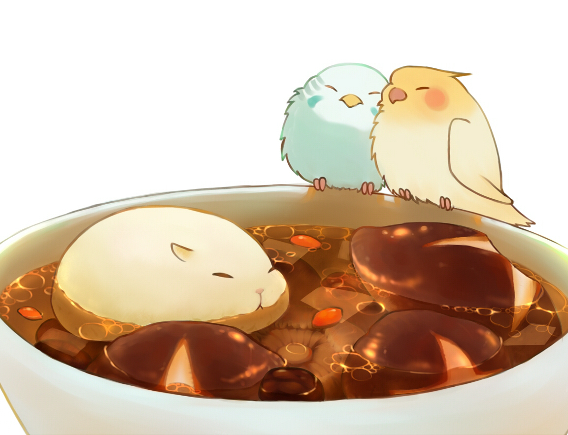 :< ^_^ animal_focus bad_id bad_pixiv_id bird blush bowl closed_eyes commentary echosdoodle food food_focus mushroom no_humans original simple_background soup white_background