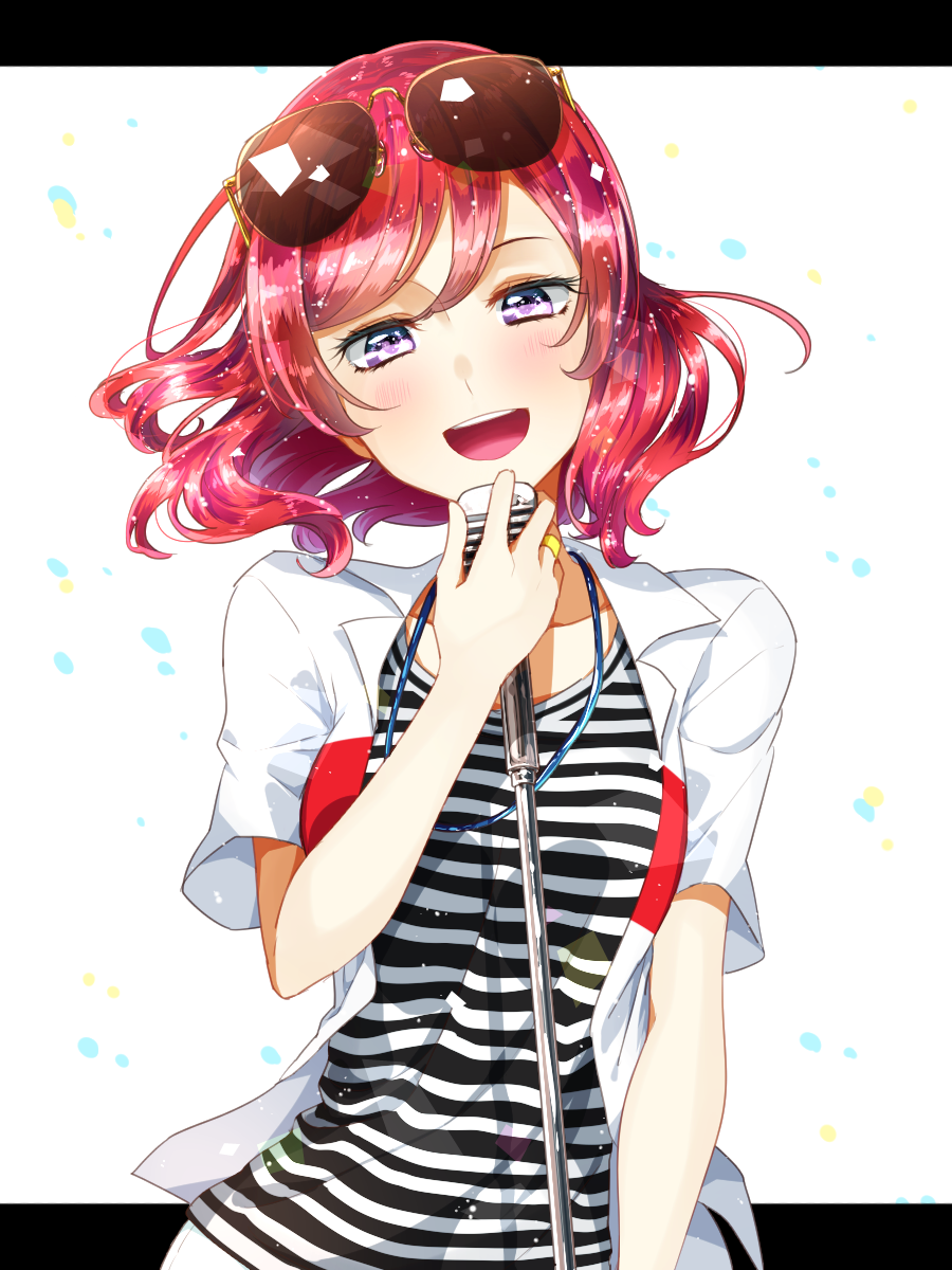1girl bad_id bad_pixiv_id collared_shirt commentary_request eyewear_on_head female_focus highres looking_back love_live! love_live!_school_idol_festival microphone niro_(sikabanekurui) nishikino_maki open_mouth purple_eyes red_hair shirt solo striped_clothes striped_shirt sunglasses