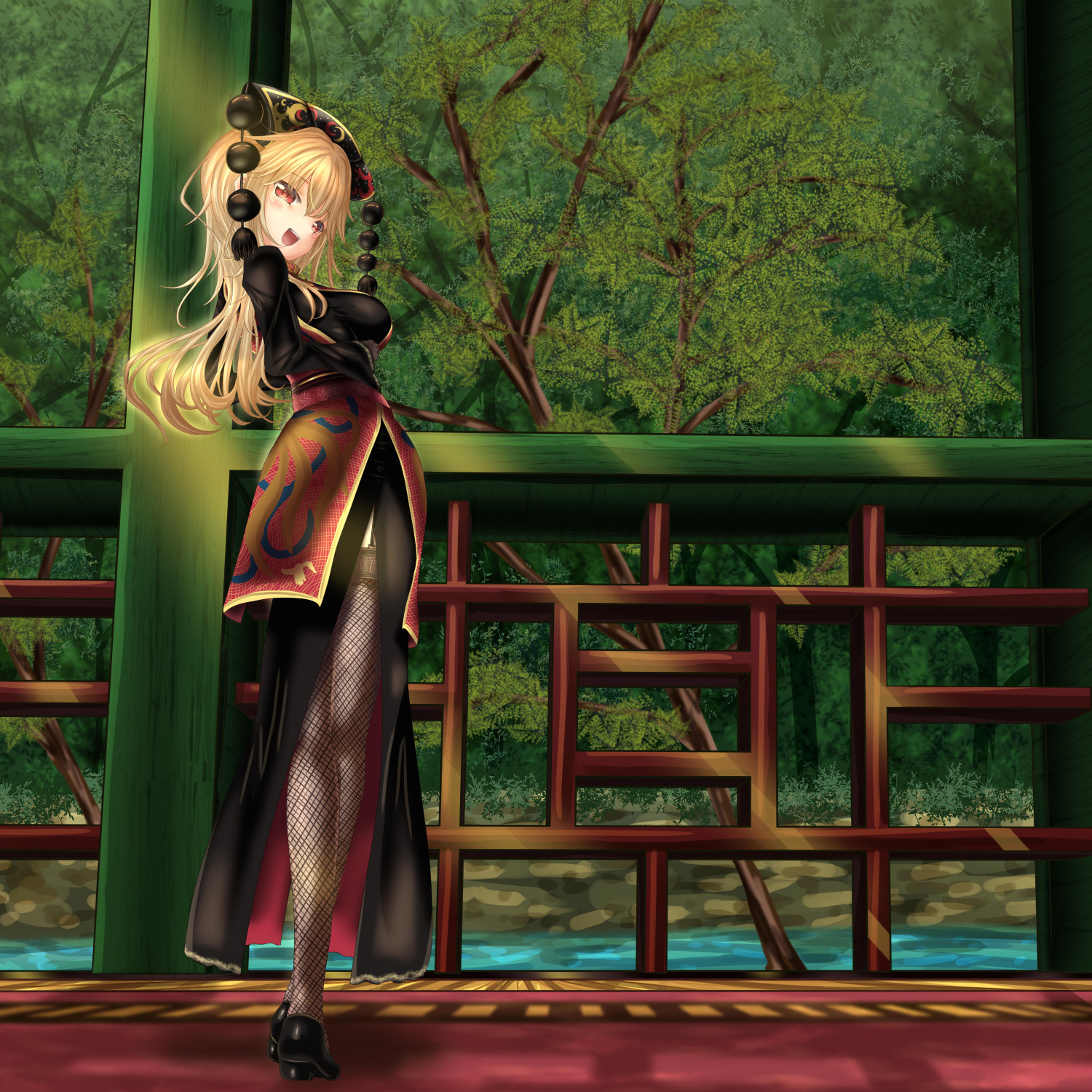 1girl architecture black_dress black_gloves blonde_hair blush breasts commentary_request dress east_asian_architecture fence fishnet_thighhighs fishnets gloves grass happy headdress highres junko_(touhou) large_breasts long_dress long_hair long_sleeves looking_at_viewer obi open_mouth orange_hair red_eyes river sash scenery shaded_face shounen_(hogehoge) side_slit sideboob smile standing tabard teeth thighhighs touhou tree water wavy_hair