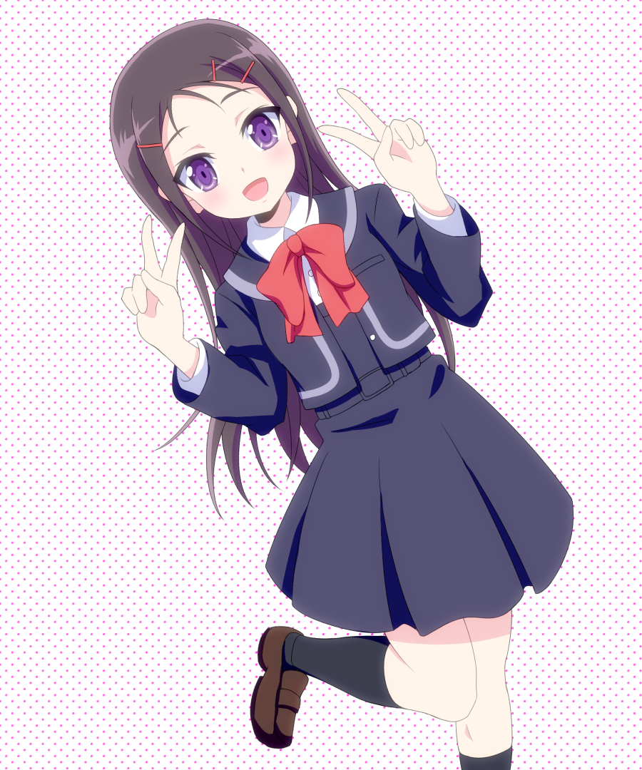 10s 1girl black_hair black_socks charlotte_(anime) double_v female_focus hair_ornament hairclip leaning_to_the_side long_hair looking_at_viewer mamiyama open_mouth otosaka_ayumi polka_dot polka_dot_background purple_eyes school_uniform socks solo standing standing_on_one_leg v