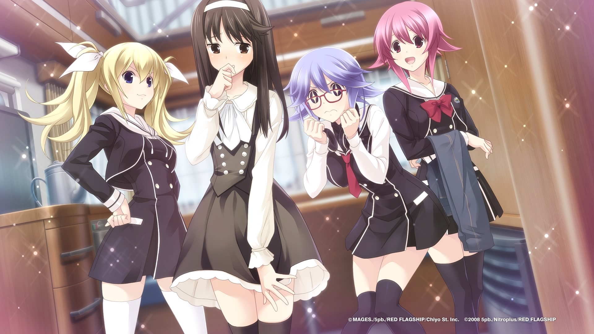 10s 1boy 3girls :d arimura_hinae black_dress black_hair black_legwear blonde_hair blue_eyes blue_hair blush bow bowtie chaos;child chaos;child_love_chu_chu!! collarbone crossdressing dress game_cg glasses hair_between_eyes hair_ribbon hairband hands_on_own_hips headphones headphones_around_neck highres holding indoors kazuki_hana long_hair multiple_girls neckerchief necktie official_art onoe_serika open_mouth pink_hair red_bow red_bowtie red_eyes red_necktie ribbon sasaki_mutsumi school_uniform science_adventure short_dress short_hair_with_long_locks short_necktie sidelocks smile sparkle sparkling_eyes standing tachibana_yuuto thighhighs trap twintails white_hairband white_legwear white_neckerchief white_ribbon zettai_ryouiki