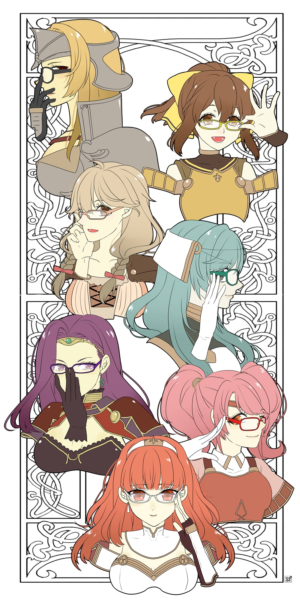 6+girls armor bare_shoulders blonde_hair bow braid breastplate breasts brown_hair celica_(fire_emblem) cleavage delthea_(fire_emblem) earrings fangs faye_(fire_emblem) fingerless_gloves fire_emblem fire_emblem_echoes:_shadows_of_valentia glasses gloves green_eyes green_hair helmet highres jewelry kaiji0324 long_hair low-braided_long_hair low-tied_long_hair mae_(fire_emblem) mathilda_(fire_emblem) multiple_girls nintendo open_mouth pink_hair ponytail purple_eyes purple_hair red_eyes red_hair sonya_(fire_emblem_gaiden) tatiana_(fire_emblem) tiara twin_braids twintails white_background