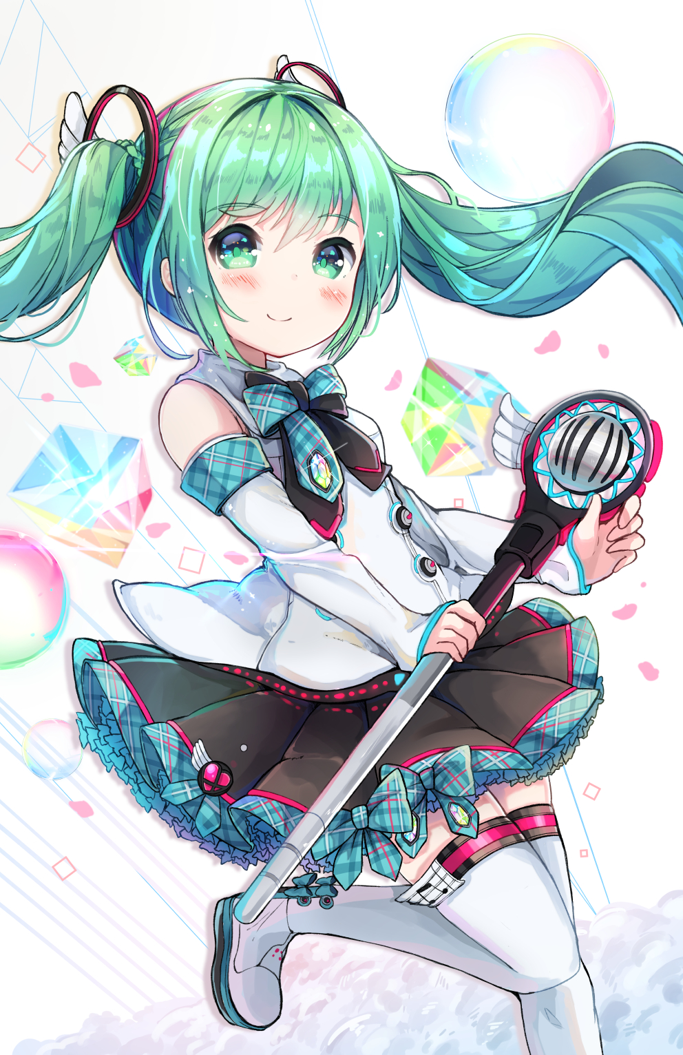 1girl bad_id bad_pixiv_id boots detached_sleeves female_focus floating_hair green_eyes green_hair hatsune_miku highres long_hair magical_mirai_(vocaloid) magical_mirai_miku magical_mirai_miku_(2017) microphone namuya_(dlcjfgns456) skirt smile solo thigh_boots thighhighs twintails vocaloid white_background