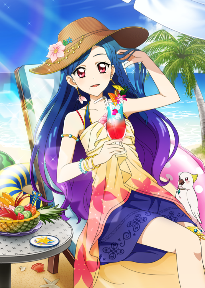 1girl aikatsu! aikatsu!_(series) aikatsu!_photo_on_stage!! beach bird blue_hair bracelet braid chair cocktail cocktail_glass cocktail_umbrella cup day drinking_glass drinking_straw earrings floral_print flower food fruit fruit_cup hand_in_own_hair hat hurricane_glass ice ice_cube innertube jewelry kazesawa_sora kiwi_(fruit) long_hair mole multicolored_hair ocean orange_(fruit) orange_slice orchid palm_(aikatsu!) palm_tree parrot patterned_clothing pearl_bracelet pineapple pink_eyes sand shell sitting smile starfish strawberry sun_hat sunlight swim_ring tree tropical_drink