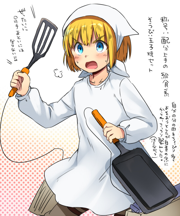 1boy apron armin_arlert blonde_hair blue_eyes blush headscarf japanese_clothes kappougi male_focus marimo_danshaku open_mouth shingeki_no_kyojin short_hair solo spatula sweatdrop tenugui traditional_clothes white_headscarf