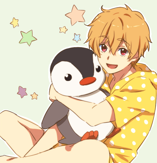 10s 1boy bird blonde_hair free! hazuki_nagisa looking_at_viewer male_focus minagawa open_mouth penguin red_eyes smile solo star_(symbol) stuffed_animal stuffed_penguin stuffed_toy