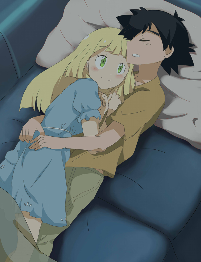 1boy 1girl ash_ketchum black_hair blonde_hair blue_dress blunt_bangs blush brown_shirt closed_eyes couch couple dress green_eyes green_pants hetero hug kuriyama lillie_(pokemon) night_dress nightgown nintendo official_alternate_costume pajamas pants pillow pokemon pokemon_(anime) pokemon_sun_and_moon pokemon_sm029 pokemon_sm048 pokemon_the_series:_sun_&_moon shirt sleeping sleepover spiked_hair