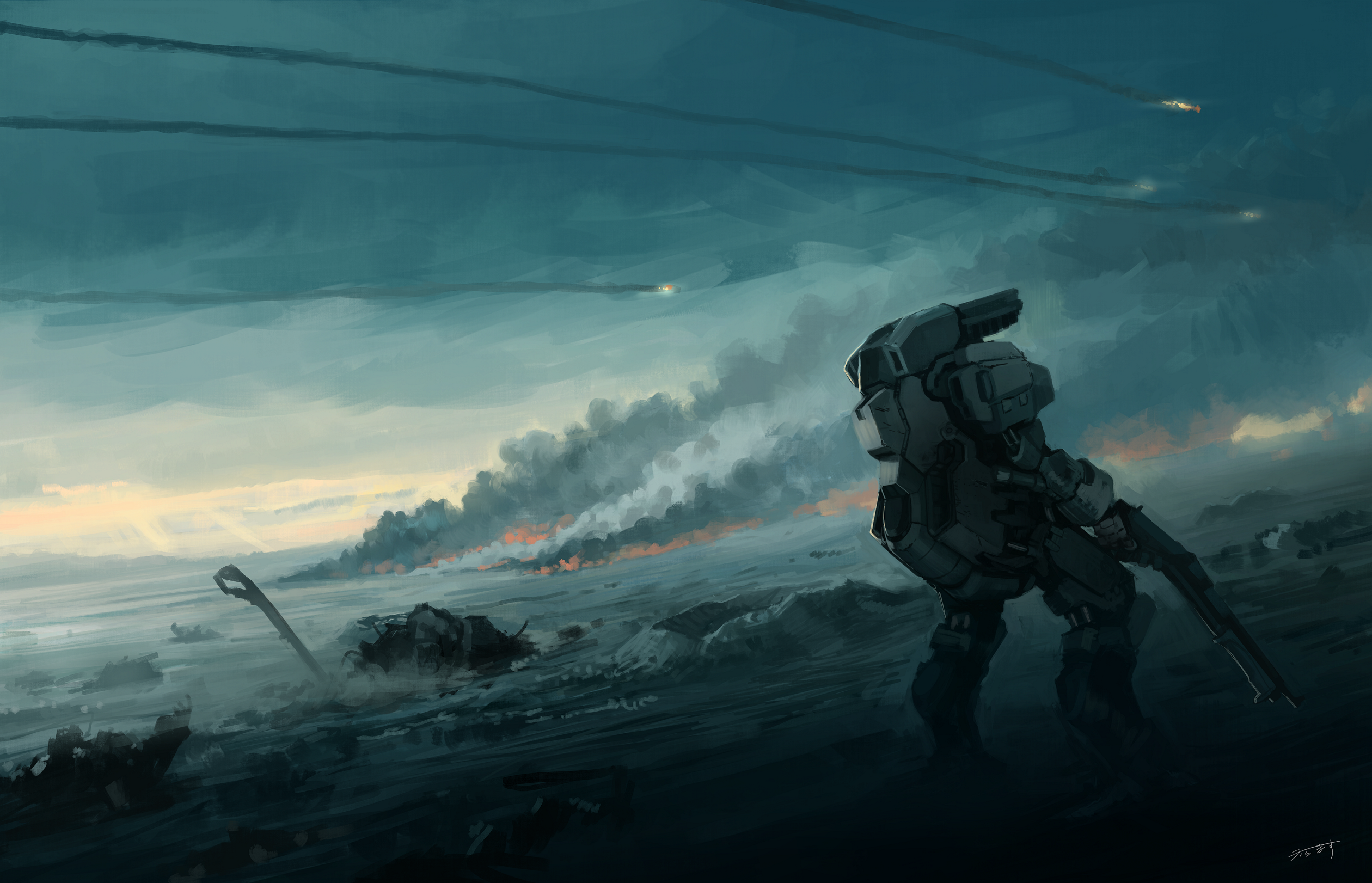 armor cloud commentary contrail crater desert flying gun highres karamas mecha original power_armor realistic robot scenery science_fiction shotgun shoulder_cannon signature smoke sword weapon