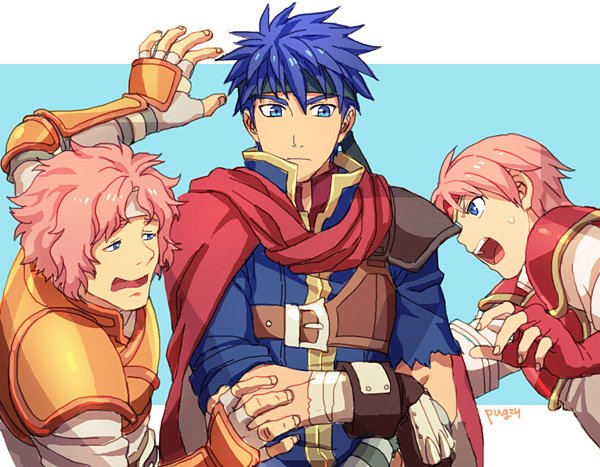 1girl 2boys angry arm_up armor bad_id bad_twitter_id bandaged_arm bandages black_headband blue_background blue_eyes blue_hair brother_and_sister cape closed_mouth crossed_arms eye_contact fingerless_gloves fire_emblem fire_emblem:_path_of_radiance gloves hair_between_eyes headband ike_(fire_emblem) knight looking_at_another makalov_(fire_emblem) marcia_(fire_emblem) matching_hair/eyes multiple_boys nervous nintendo open_mouth orange_armor pauldrons pegasus_knight_uniform_(fire_emblem) pink_hair red_armor red_cape red_gloves red_tiara round_teeth sandwiched scared serious shoulder_armor shouting siblings simple_background sweat teeth tiara upper_body white_headband