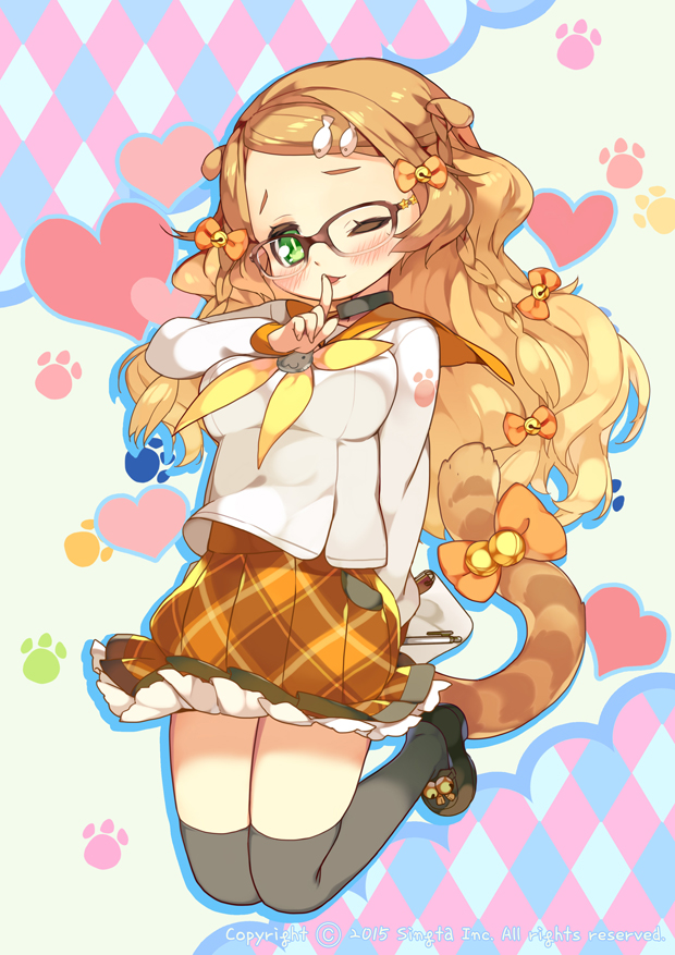 1girl animal_ears black_thighhighs blonde_hair blush bow breasts btoor cat_ears cat_tail copyright_notice dated female_focus finger_to_mouth full_body glasses green_eyes hair_bow loafers looking_at_viewer one_eye_closed paw_print plaid_clothes plaid_skirt pleated_skirt school_uniform serafuku shoes sid_story skirt solo tail tail_bow tail_ornament thighhighs