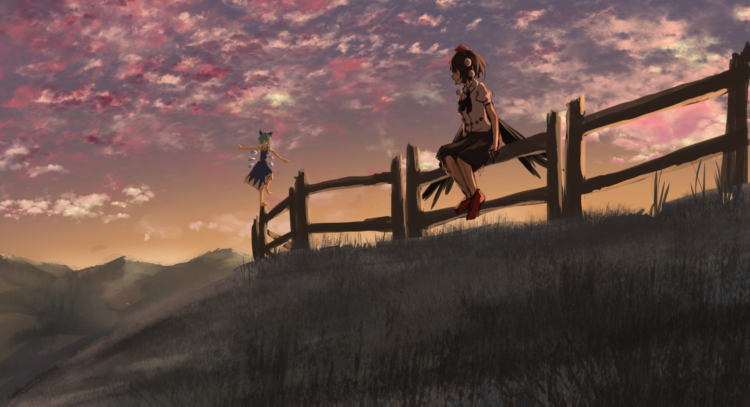 2girls balancing barefoot bird_wings black_hair black_skirt black_wings blue_bow blue_dress bow cirno cloud cloudy_sky commentary_request dress feathered_wings fence grass hair_bow hat ice ice_wings multiple_girls nature outdoors pom_pom_(clothes) puffy_short_sleeves puffy_sleeves red_footwear roke_(taikodon) shameimaru_aya shirt shoes short_sleeves sitting skirt sky sunset tokin_hat touhou white_shirt wings