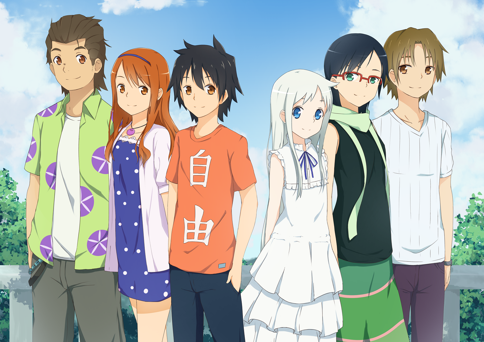 3boys 3girls 53c_(ray_cordova) alternate_hairstyle anjou_naruko ano_hi_mita_hana_no_namae_wo_bokutachi_wa_mada_shiranai. aqua_eyes blue_eyes brown_hair casual cloud day dress hands_in_pockets highres hisakawa_tetsudou honma_meiko long_hair looking_at_viewer matsuyuki_atsumu multiple_boys multiple_girls short_hair silver_hair sky tsurumi_chiriko yadomi_jinta