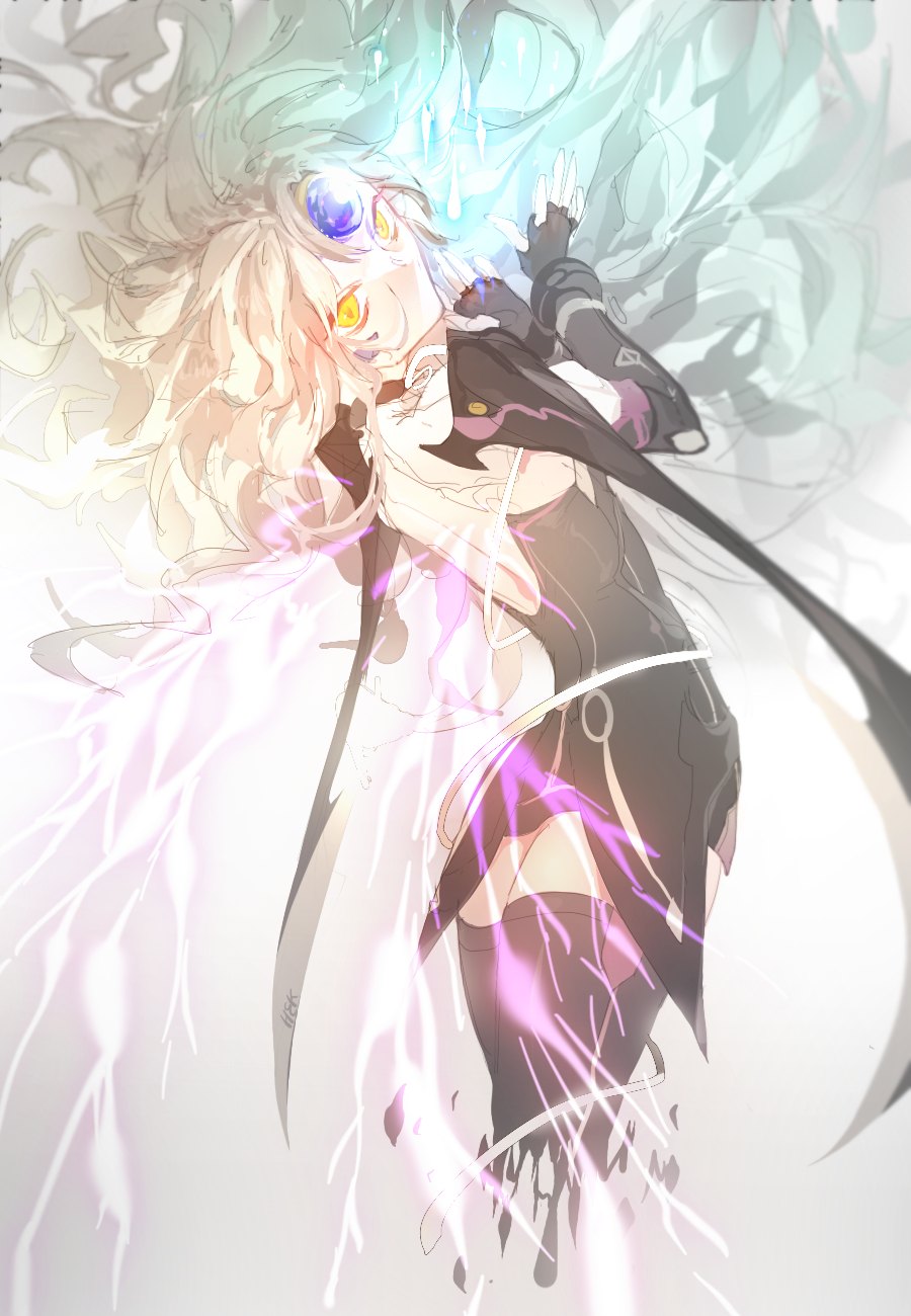 1girl armor armor_wings artist_request black_dress black_gloves black_skirt black_thighhighs blonde_hair blue_electricity boots code:_nemesis_(elsword) dress electric_wings elsword eve_(elsword) facial_mark female_focus fingerless_gloves forehead_jewel gloves highres legs_together long_hair looking_at_viewer miniskirt pink_electricity raven_cronwell short_dress silver_hair skirt solo standing thigh_boots thighhighs very_long_hair yellow_eyes