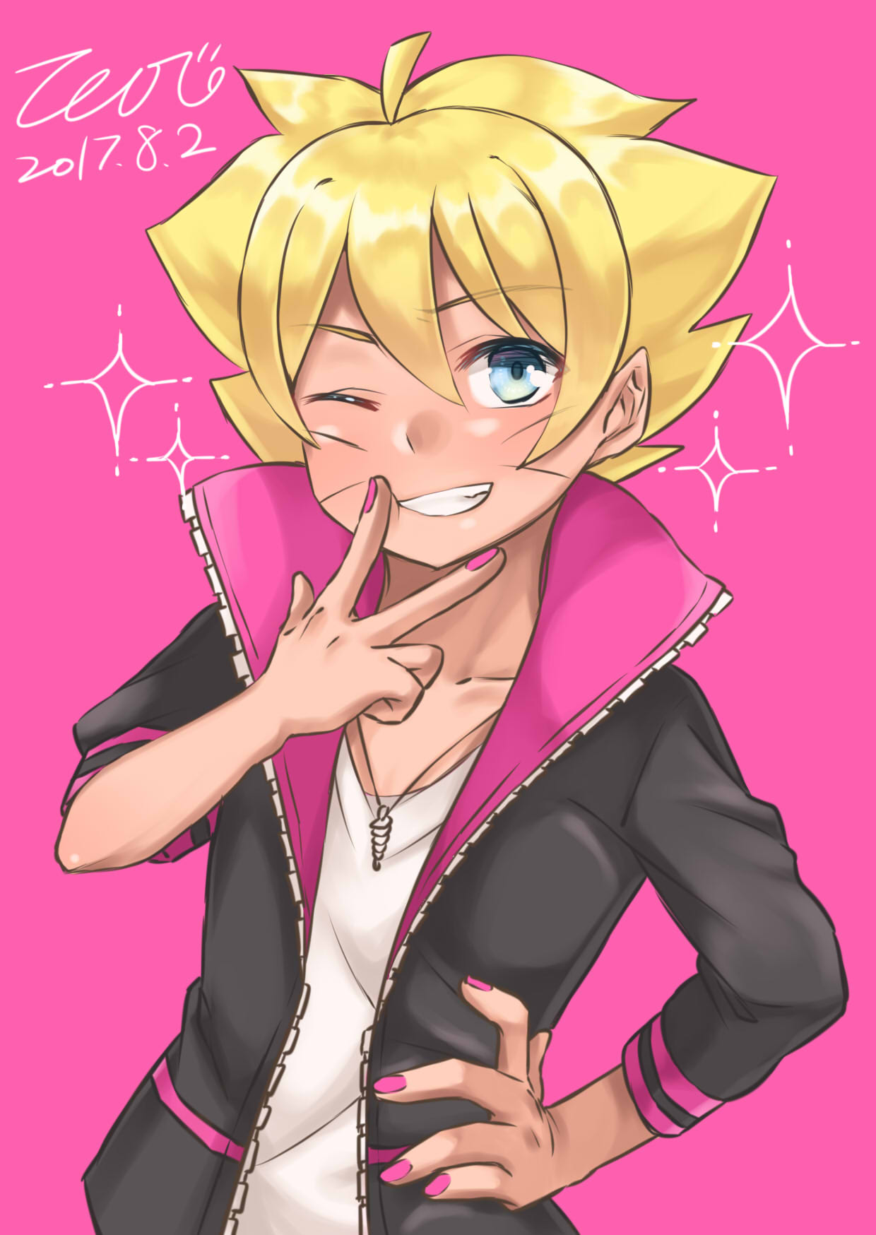 1boy ahoge blonde_hair blue_eyes dated grin highres jewelry kanchaji male_focus nail_polish naruto_(classic) naruto_(series) necklace one_eye_closed smile solo uzumaki_boruto v