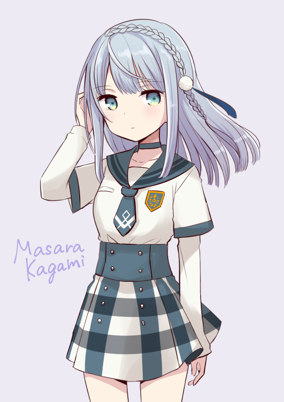 1girl adjusting_hair arm_at_side black_neckerchief black_sailor_collar blunt_bangs blush braid character_name checkered_clothes checkered_skirt chuo_academy_school_uniform closed_mouth collarbone corset cowboy_shot crown_braid expressionless female_focus gingham_clothes gingham_skirt green_eyes grey_background hair_ornament hand_up kagami_masara layered_sleeves long_hair long_sleeves looking_at_viewer mahou_shoujo_madoka_magica neckerchief pink_background quro_(black_river) sailor_collar school_uniform serafuku short_over_long_sleeves short_sleeves silver_hair simple_background skirt solo standing swept_bangs