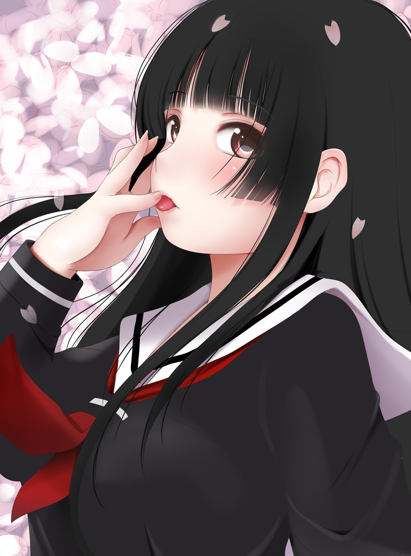1girl black_hair black_serafuku blunt_bangs breasts commentary_request enma_ai female_focus from_side jigoku_shoujo kozue_akari large_breasts licking licking_finger long_hair neckerchief open_mouth petals red_eyes red_neckerchief school_uniform serafuku solo tongue tongue_out upper_body wind
