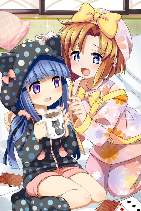 2girls alternate_hairstyle animal_hood blue_eyes blue_hair blunt_bangs blush bow card child cup drink floral_print furude_rika futon hat higurashi_no_naku_koro_ni hood hot_chocolate kamaboko_red long_hair long_sleeves looking_at_another low_twintails mug multiple_girls open_mouth orange_hair pajamas pillow playing_card polka_dot purple_eyes raised_eyebrows ryuuguu_rena short_hair shorts sitting sleepover smile tatami twintails